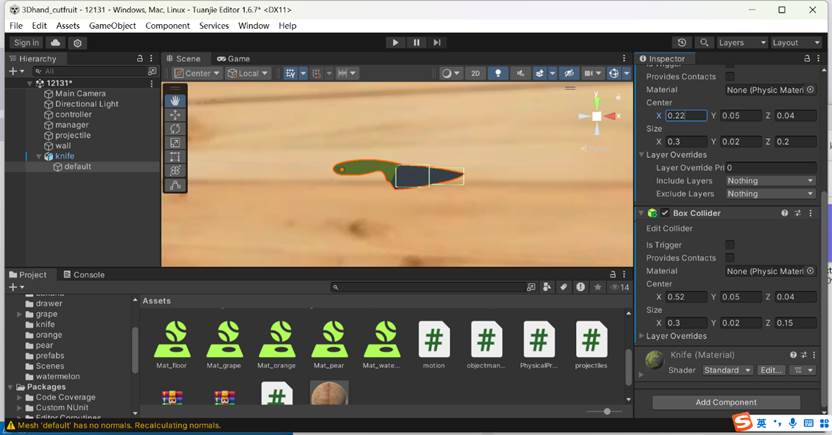- 碰撞体配置:为刀具添加Box Collider和Mesh Collider,调整碰撞体范围至刀刃区域,确保仅刀刃接触水果时触发切割;