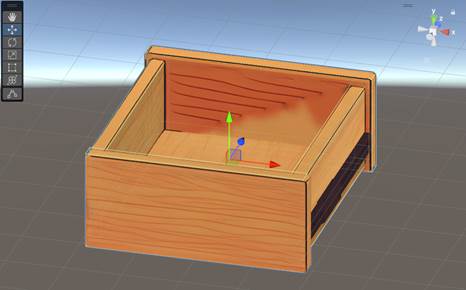 指物体(如水果碎块)掉落出屏幕边界后被销毁回收,以优化性能。在交互反馈环节,抽屉与水果的碰撞交互是物理系统的核心难点。由于抽屉模型具有中空的凹陷结构,直接使用默认的凸包(Convex)碰撞体会导致水果无法落入抽屉内部,而使用高精度的凹面网格碰撞体则会带来巨大的计算压力。为此,本项目采用了复合碰撞体(Compound Collider)方案,即利用五个独立的立方体碰撞体(Box Collider)分别构建抽屉的底板与四个侧壁。这种方案在保证物理轮廓准确性的同时,极大地降低了运算复杂度,有效杜绝了水果在高速运动中穿透抽屉模型的现象。为了解决刚体碰撞中常见的"回弹抖动"问题,系统将抽屉的刚体配置为运动学模式(Is Kinematic),并通过 Rigidbody.MovePosition 方法在物理帧中驱动其平滑移动,使其表现为具有无限质量的"无敌"容器,能够稳定地推开或承接水果。