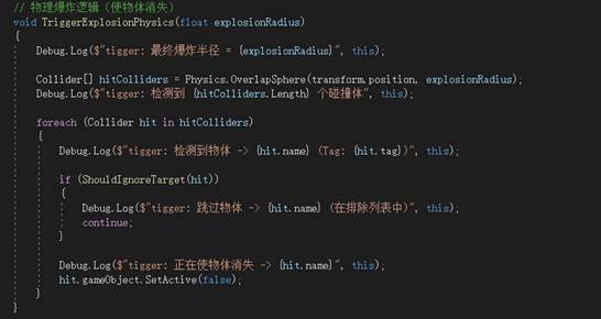 物理爆炸:在TriggerExplosionPhysics方法中通过检测爆炸半径内的所有碰撞体,通过ShouldIgnoreTarget方法筛选需忽略的物体,包括炸弹自身、标签为 "Ground"和 "Player"的对象,避免误操作。对非忽略对象执行SetActive(false)操作,使其隐藏(而非直接销毁),后续可通过设置SetActive(true)重新启用,实现对象复用,优化性能。