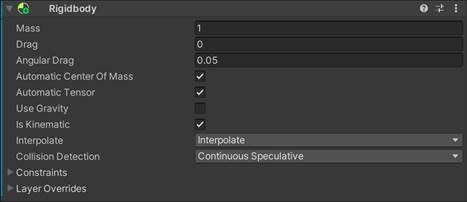 - 刚体配置:添加Rigidbody组件,勾选 "是运动学的"以避免刀具受物理重力影响偏移,碰撞检测模式设为 "连续",提升高速移动时的碰撞检测精度。