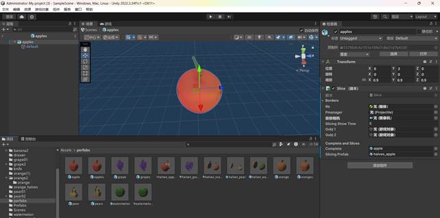 添加切割逻辑脚本Slice.cs,是空对象。包括slice(碎块体)和complete(完整体)两个子组件,调整Transform参数,使缩放匹配父对象。在脚本参数中关联对应 slicing 层预制体,确保切割后可自动生成切片体,配置完成,形成完整的交互预制体。