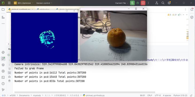 (2)模型构建(编写代码:ptcloud_synthesis.py; pt_cloud.py)------构建初步的Structure From Motion算法,通过深度相机多张图片扫描水果构建3D点云模型并使用MeshLab转换为obj模型文件,目前进度(红色未完成): 2D相机(单目)姿态估计八点法(8x9矩阵构建)--本质矩阵提取--旋转矩阵/平移方向向量计算--基于RGBD全背景数据的2D to 3D 多视角点云集群计算--固定点数下采样(open3d库未实现FPS(最远点采样)算法,需要使用二分法体素下采样和随机下采样结合的方式控制点数恒定且相等)---平移方向向量的尺度均值法(非传统最小二乘法)估计---基于RGBD物体(水果)数据的2D to 3D 多视角点云集群计算(使用预制mask图片进行色度的"颜色滤波",并加入膨胀操作确保物体的像素连续性)--多视角点云拼接(仅相邻视角局部优化);