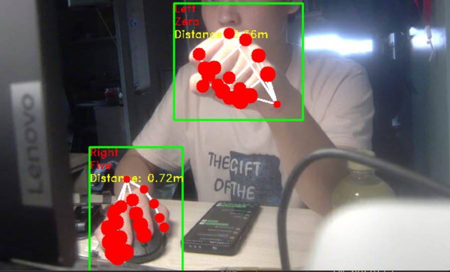 (3)使用OpenCV-DNN的手掌识别模型识别掌根坐标、进行手部动作判断(0代表控制水果刀,1代表拉开抽屉,2代表合上抽屉);