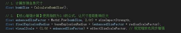 - 参数计算:通过CalculateBombSize方法计算炸弹实际尺寸,采用指数为 2.0 的公式放大尺寸对爆炸效果的影响,使不同规格炸弹的爆炸差异更显著。