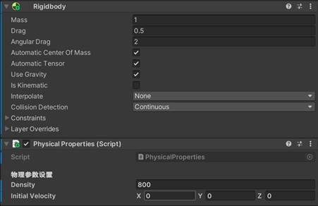 挂载motion.cs和PhysicalProperties.cs脚本,选中水果完整体模型(未被刀具切割),添加Rigidbody、Collider等,水果的完全体会与其他物体碰撞,故需注意碰撞体的配置。可配置参数包括6类水果随机生成的最小体积、最大体积、6类水果的密度(均匀)、随机生成的最小初速度、最大初速度。