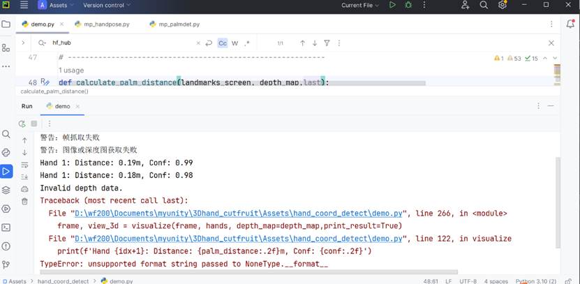 - 启动视觉端 (Python):在 Python 环境中运行hand_coord.py。程序启动后,将初始化 Gemini 相机,开始捕捉深度流和彩色流。程序会自动识别视野内的手部,并在终端输出识别到的手势信息和坐标数据,同时开始尝试连接 Unity 端的 Socket 服务。