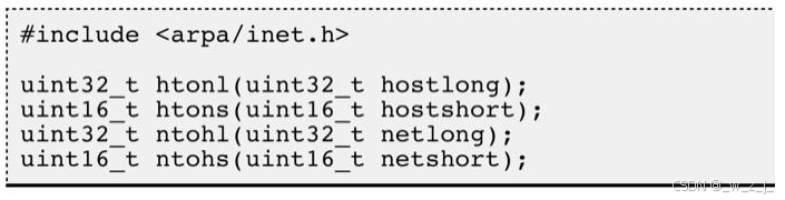 • 这些函数名很好记,h 表示 host,n 表示 network,l 表示 32 位长整数,s 表示 16 位短整数。