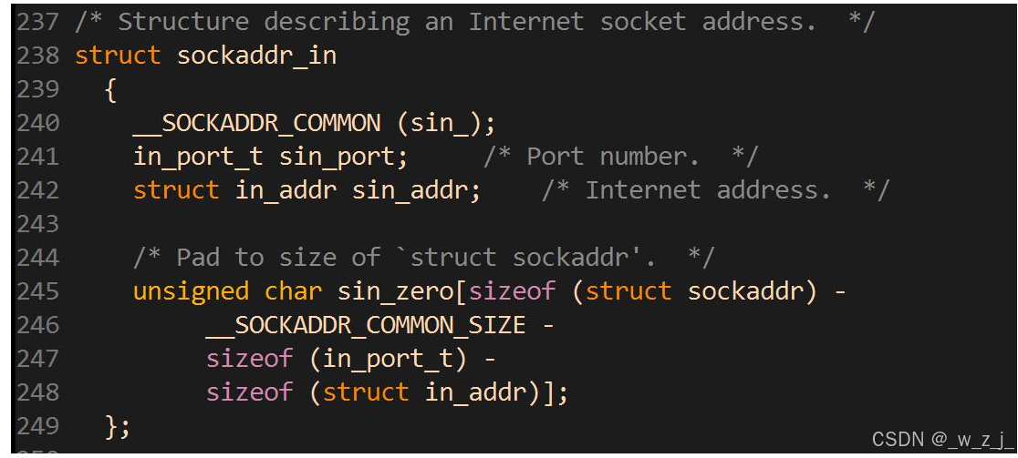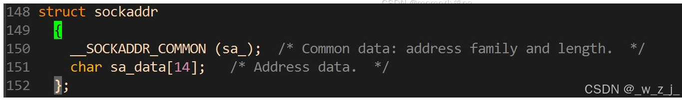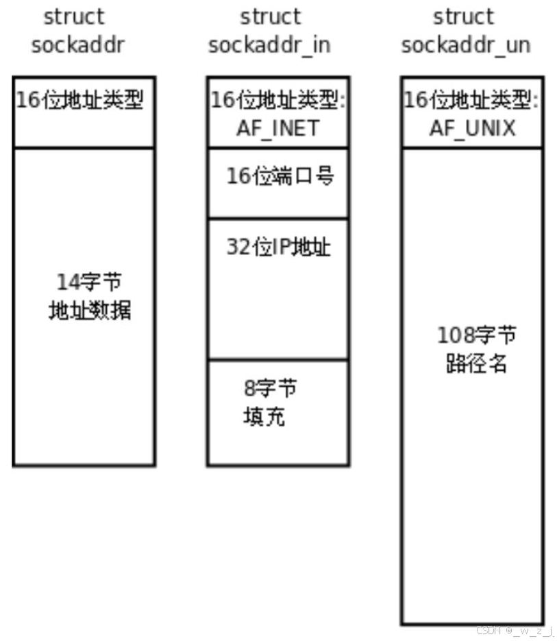 cppstruct sockaddr_in { sa_family_t sin_family; // AF_INET in_port_t sin_port; // 端口 struct in_addr sin_addr; // IPv4 地址 unsigned char sin_zero[8]; };sockaddr_in6 ipv6