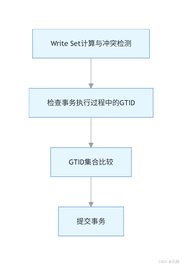 MGR 的核心目标之一是防止多节点并发修改同一条记录,其冲突检测机制通过 "Write Set 指纹 + GTID 集合" 双重校验实现,流程如图所示: