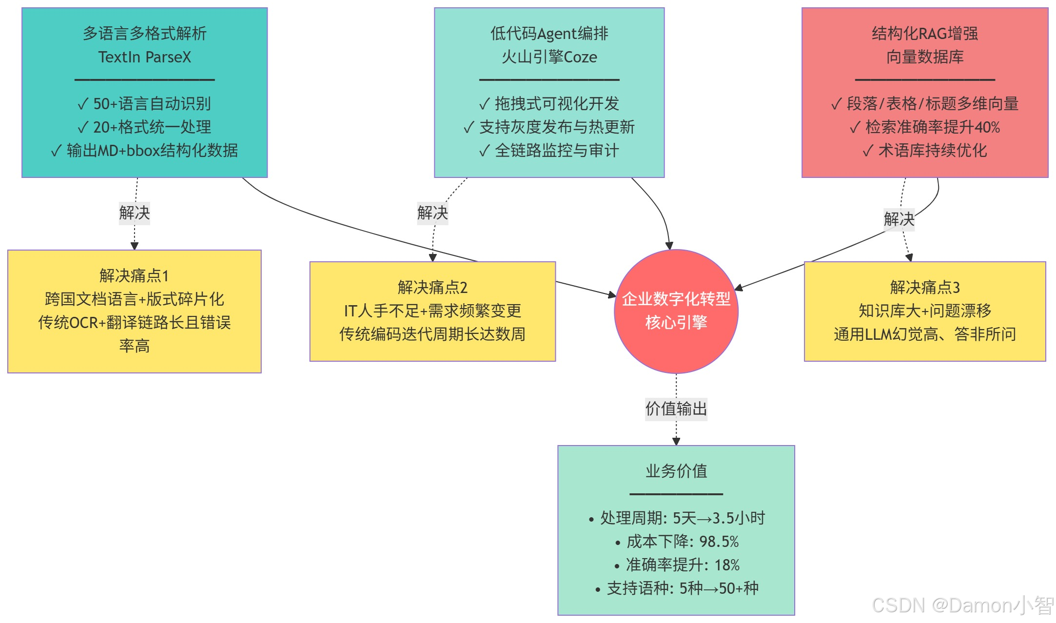 通过这个跨国药企多语言手册翻译系统的实战,我们看到了TextIn与火山引擎结合的三大核心价值。第一是多语言多格式的一站式解析能力,TextIn能够处理50+种语言、20+种格式,输出包含坐标和结构信息的标准化数据,这解决了跨国企业文档"语言+版式"碎片化的痛点。第二是低代码Agent编排能力,火山引擎Coze平台让业务人员只需拖拽几个节点就能构建复杂的AI应用,支持快速迭代和灰度发布,这解决了IT团队人手不足、需求频繁变更的困境。第三是结构化RAG增强能力,将TextIn的解析引擎接入向量数据库,让检索从纯文本升级为多维度结构化召回,准确率提升40%以上。