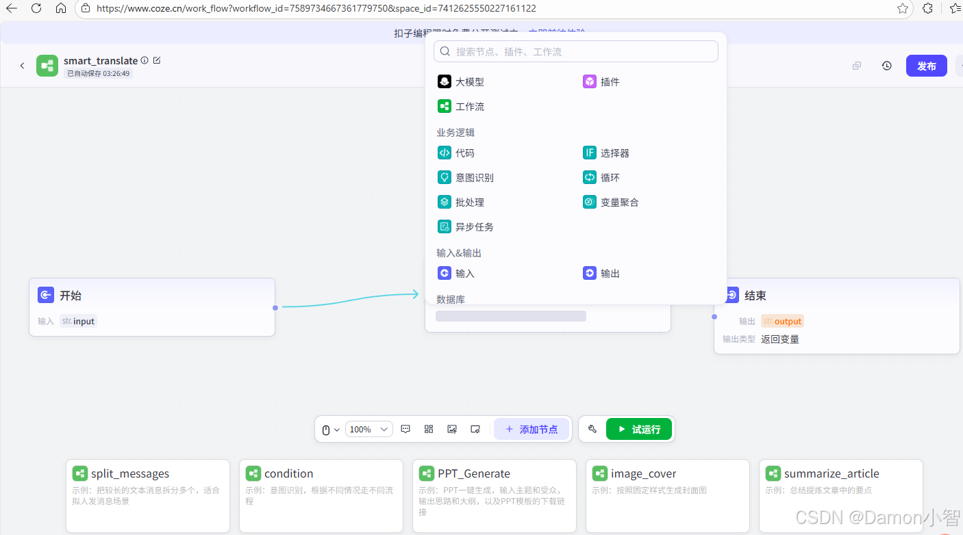 接下来在Coze平台创建智能体,命名为"多语言医药手册翻译助手"。进入工作流编排画布后,我们开始逐个添加核心节点。