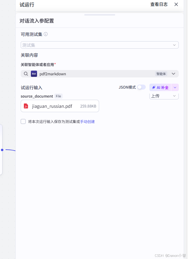 至此,整个工作流的搭建就完成了。我们点击右上角的"测试运行"按钮进行验证。上传一份真实的药品说明书PDF,选择目标语言为"俄语",点击运行。