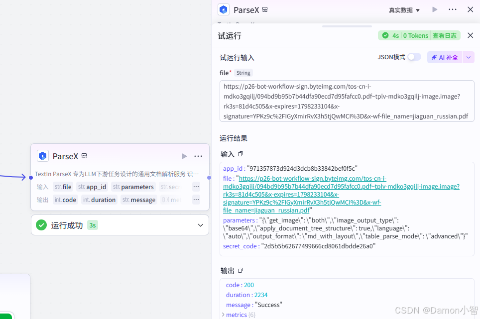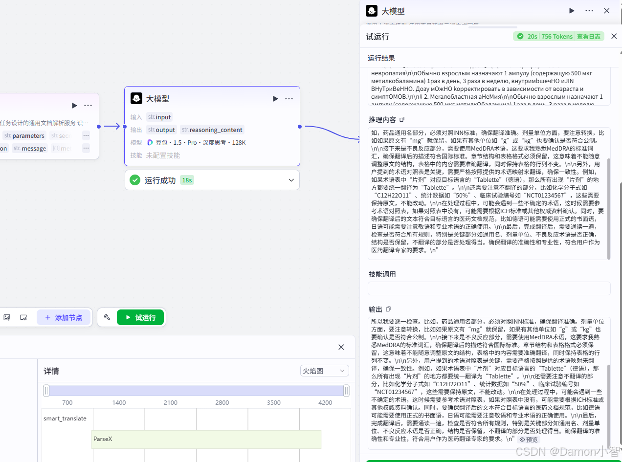 系统开始执行各个节点。首先是ParseX节点,我们可以在调试面板看到它成功识别了文档中的英文正文、拉丁学名、化学分子式,并准确还原了三个复杂的剂量对照表。