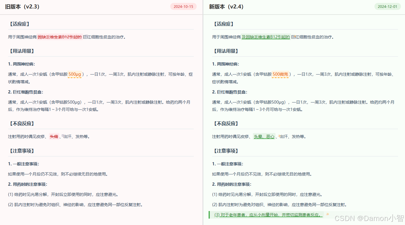 脚本会从向量数据库中检索该药品的上一个版本,然后逐段对比,将新增内容标记为绿色、删除内容标记为红色、修改内容标记为黄色。这个功能对于药监申报至关重要,因为监管部门需要清楚地看到每次修订改动了哪些内容。