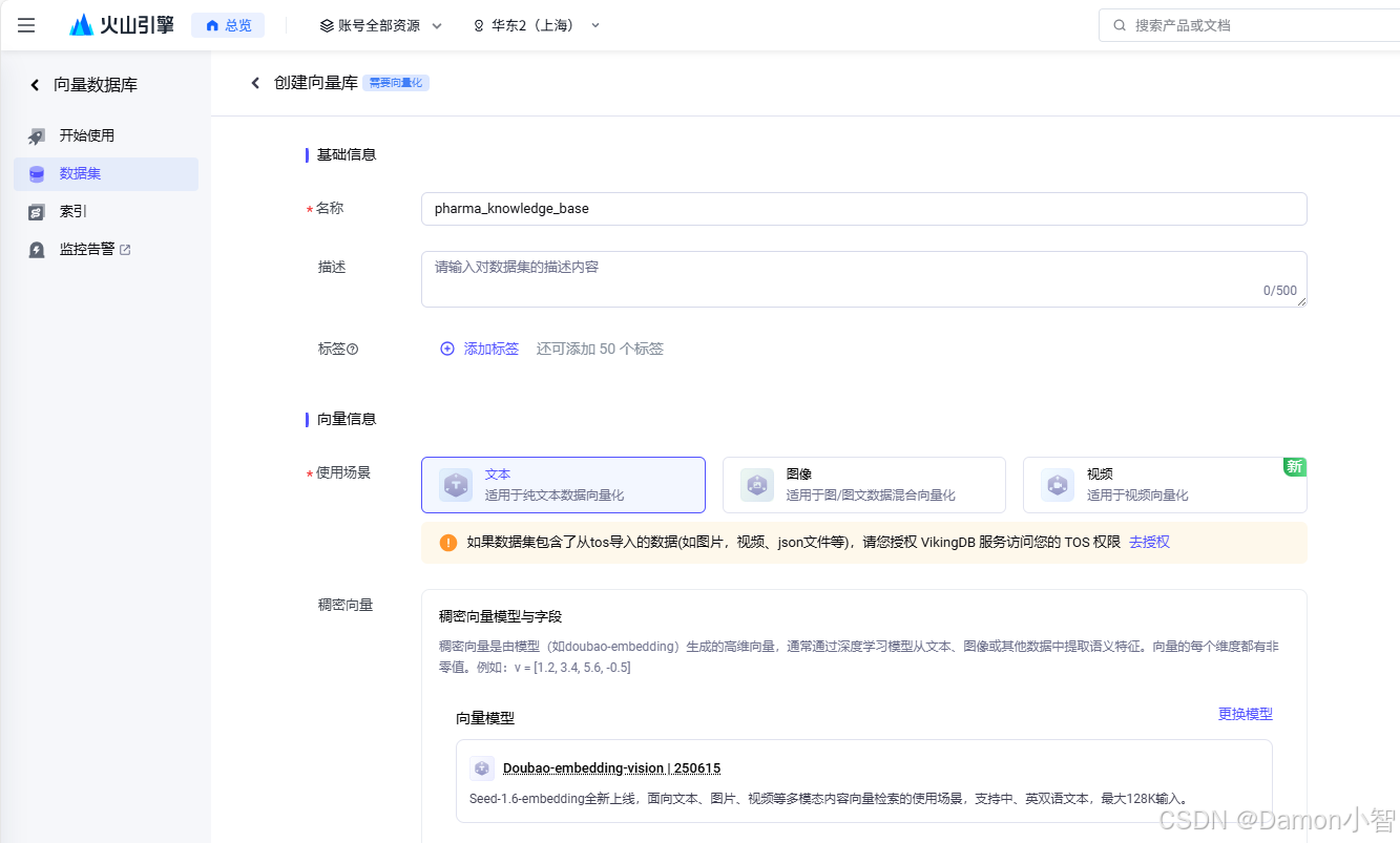 同时在火山引擎开通Coze平台和向量数据库服务。向量数据库我们命名为"pharma_knowledge_base",设置分片数为8(基于预估的文档规模),选择火山引擎的Doubao-embedding-vision | 250615作为向量化模型。这个模型在医药领域的术语理解上经过了专门优化,对于像"Adverse Drug Reaction"和"Drug-Drug Interaction"这种语义相近但含义不同的专业术语有更好的区分能力。