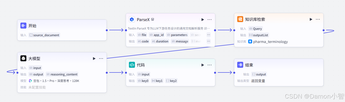 第二个节点是术语标准化节点。医药文档中充斥着大量专业术语,同一个概念可能有多种表达方式,比如"乙酰水杨酸"和"阿司匹林"指的是同一种药物。我们在ParseX节点后添加一个"知识库检索"节点,配置为检索我们预先导入的"医药术语标准库"。
