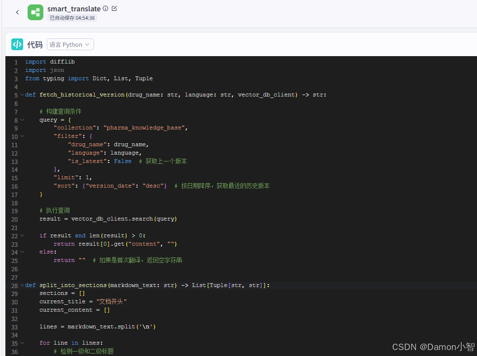 第四个节点是版本对比节点。这是本系统的一大亮点功能。我们在翻译节点后增加一个代码执行节点,编写一小段Python脚本,用difflib库对比新翻译版本与历史版本的差异。