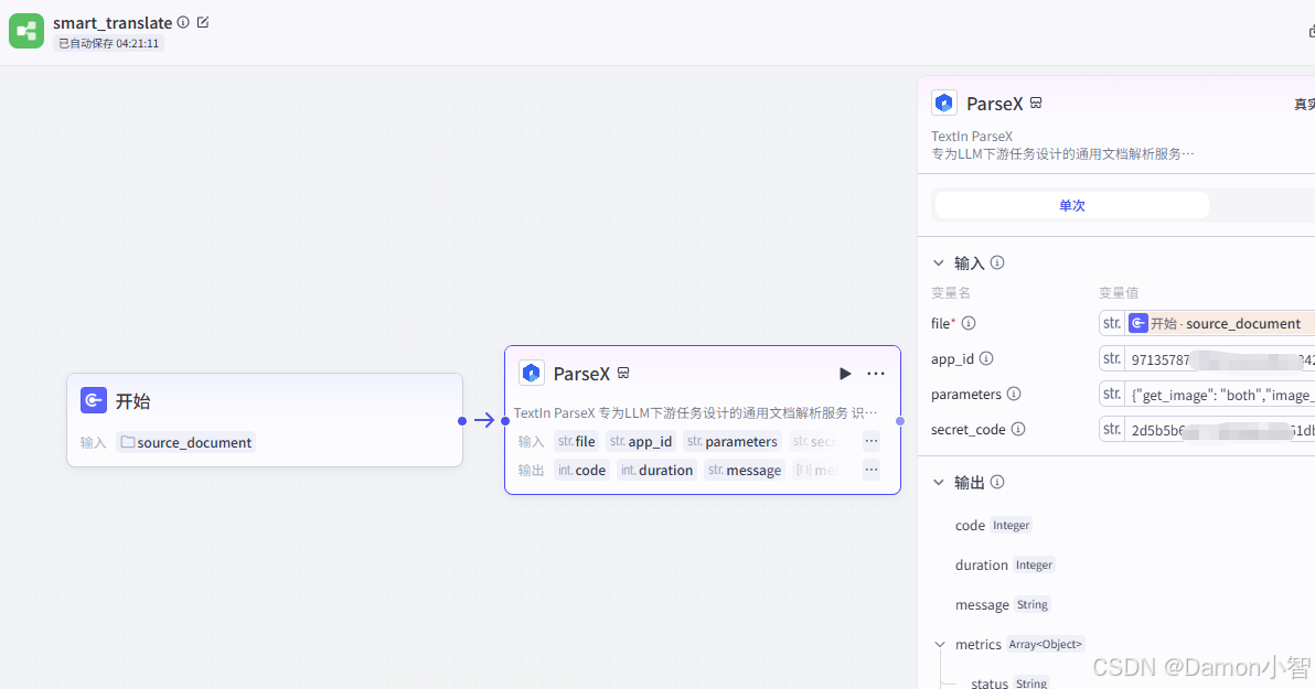添加后在节点配置面板中,我们进行详细参数设置。file参数关联到开始节点的输入变量"source_document",这样用户上传的PDF就会自动传递给解析引擎。然后填入之前获取的app_id和secret_code完成身份验证。