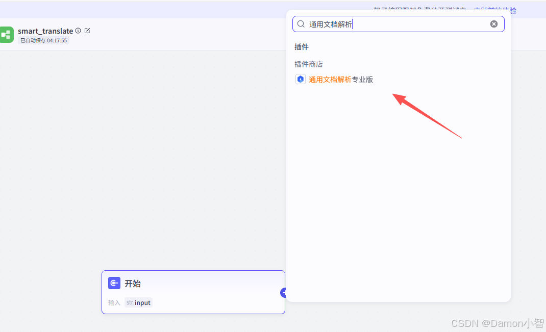 第一个节点是文档解析节点,也就是TextIn的ParseX插件。点击画布左侧的"添加节点"按钮,在插件市场搜索"通用文档解析专业版"。