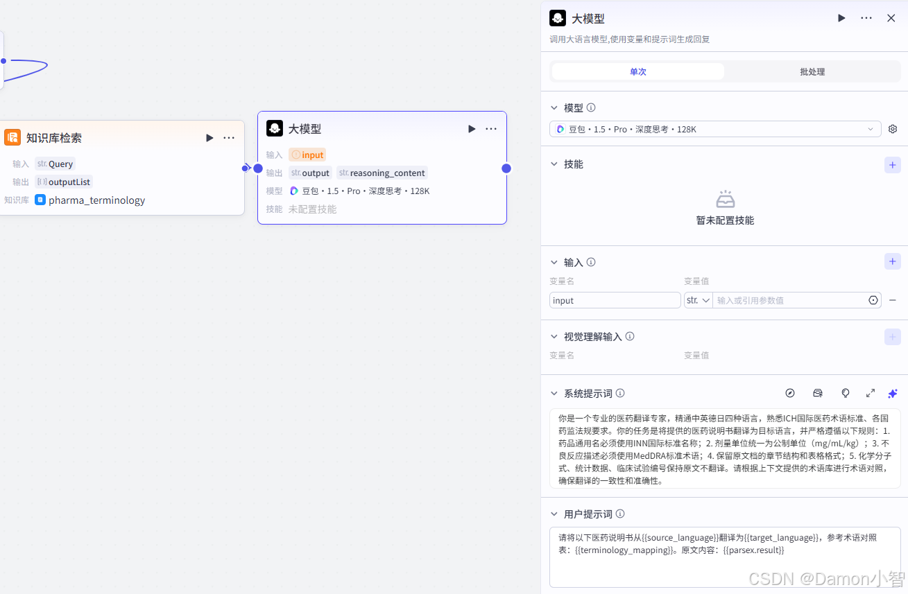 第三个节点是核心的翻译Agent节点。我们添加一个LLM节点,选择豆包大模型的pro版本(支持128K上下文,适合处理长文档)。在系统提示词中,我们这样设计: