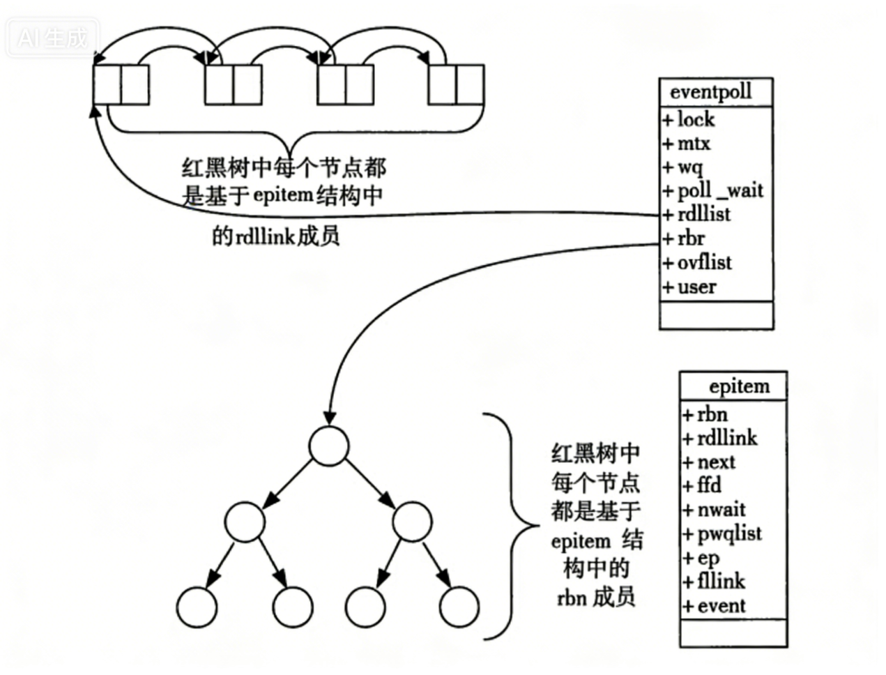 每个被 epoll 监控的 fd,都会对应一个epitem结构体(你提供的示意图中红黑树 / 双向链表的节点),它是红黑树和双向链表的 "共用节点":