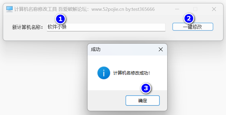 而用今天推荐的软件就非常简单,输入想要改的计算机名,点【一键修改】,最后点【确定】即可。