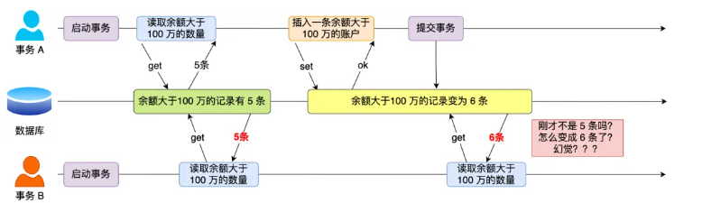 例如:假设有 A 和 B 这两个事务同时在处理,事务 A 先开始从数据库查询账户余额大于 100 万的记录,发现共有 5 条,然后事务 B 也按相同的搜索条件也是查询出了 5 条记录。