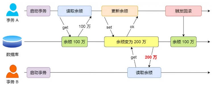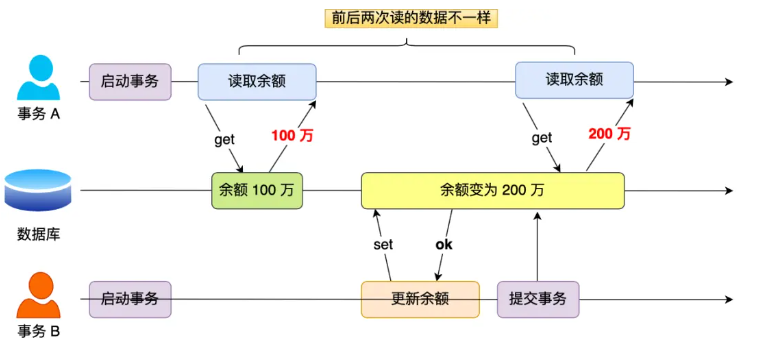 例如:假设有 A 和 B 这两个事务同时在处理,事务 A 先开始从数据库中读取小林的余额数据,然后继续执行代码逻辑处理,在这过程中如果事务 B 更新了这条数据,并提交了事务,那么当事务 A 再次读取该数据时,就会发现前后两次读到的数据是不一致的,这种现象就被称为不可重复读。