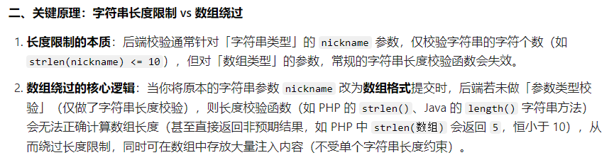 现在还有一个问题是nickname是有限制的,长度必须小于10。但是这里没有做类型判断,可以通过数组绕过。也就是将nickname改为nickname[],里面就可以塞进去上述字符串了。