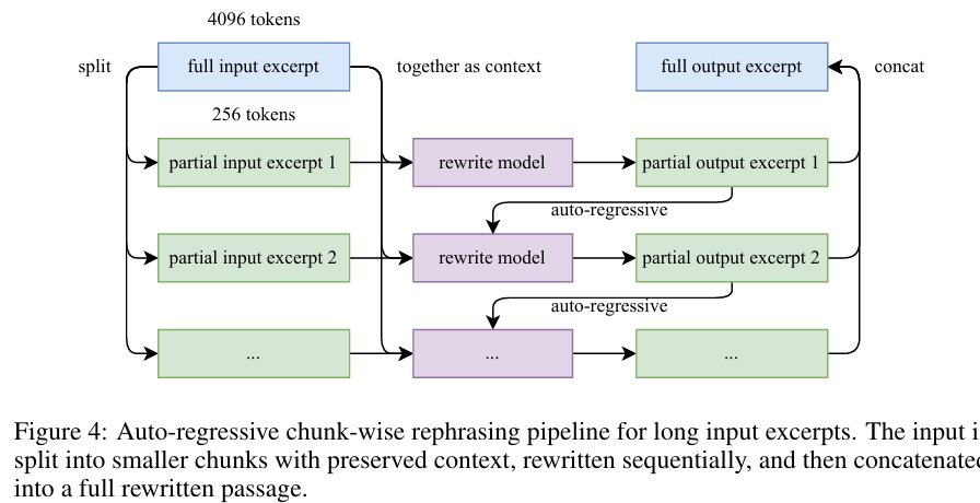 - Chunk-wise autogressive generation : 为了保持一段话的全局连贯性和避免丢失信息,将文本分成一段一段,分别进行语义重述。