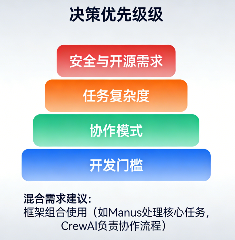 建议按以下优先级决策:安全与开源需求 → 任务复杂度 → 协作模式 → 开发门槛 。若存在混合需求(如企业级+轻量化协作),可考虑框架组合使用(如 Manus 处理核心任务,CrewAI 负责协作流程)。