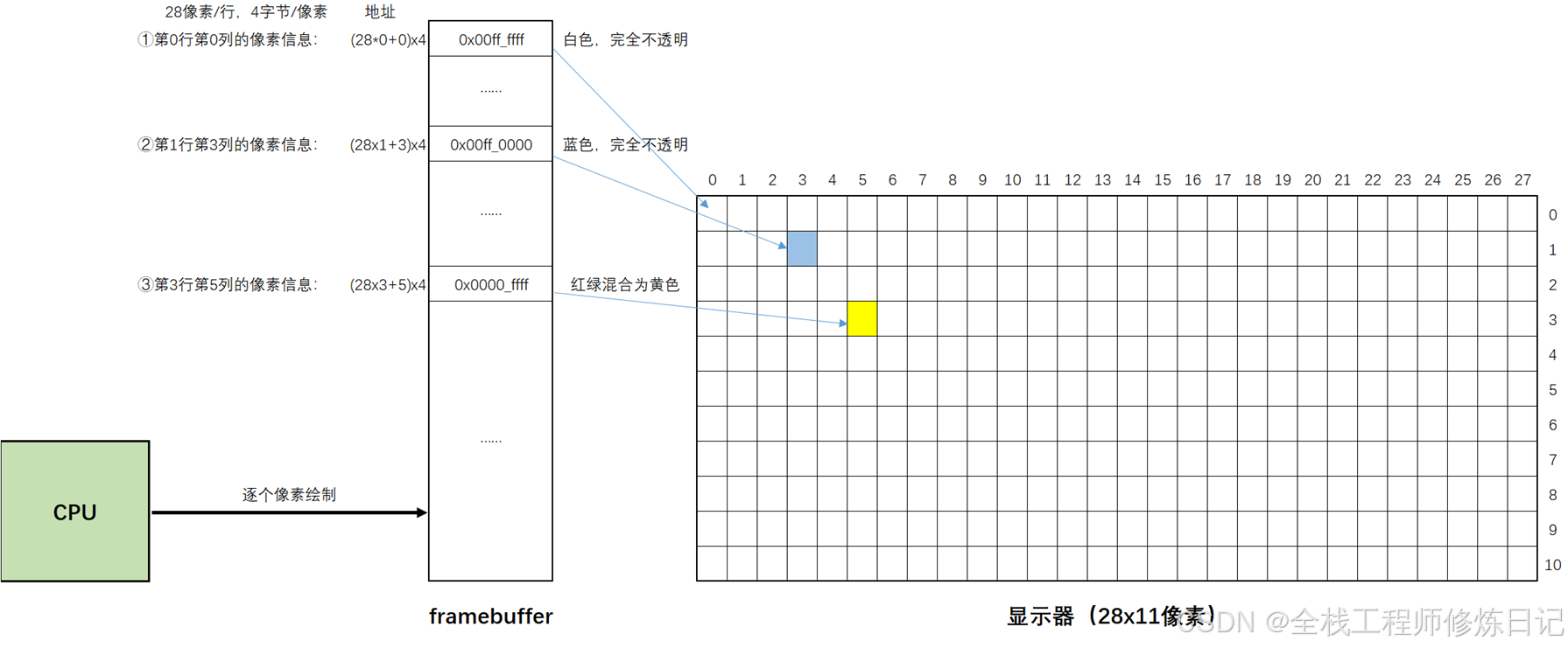 帧缓冲区是一块内存,这块内存的每一个单元,都直接对应着屏幕上的一个像素。这是一种基于内存映射的直接写屏机制。