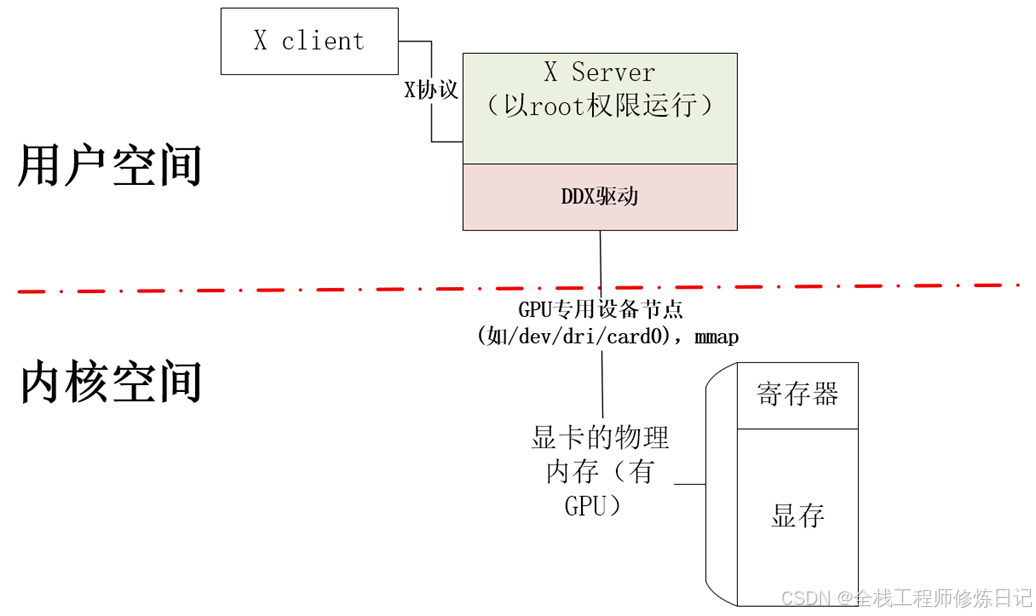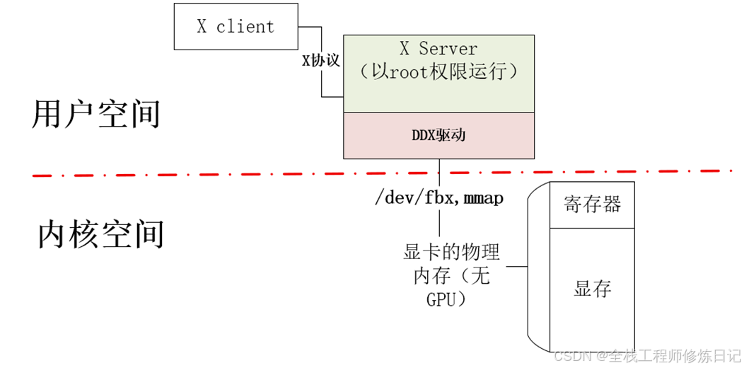 DDX(Device-Dependent X)驱动是用户空间的X Server组件,它通过/dev/fbx和直接内存映射(mmap) 的方式控制显卡。
