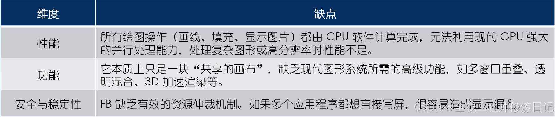 FB 的巨大优势在于其简单性。它提供了一个统一接口,屏蔽了不同显示硬件的差异,使得开发图形应用变得简单直接。同时,由于避免了不必要的数据拷贝,在简单场景下效率较高,非常适合早期的嵌入式系统和文本控制台。