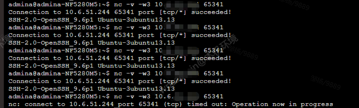 测试操作:从 10.x.xx.245(客户端)通过 nc 测试 10.x.xx.246(服务器)的 SSH 端口(默认22端口,但截图中显示端口为 65341,可能是自定义SSH端口或测试端口)。