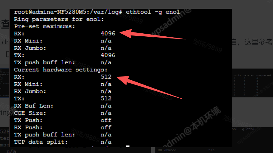ethtool -g eno1 显示:eno1接口的 当前接收缓冲区(RX Buff)为512("Current hardware settings" → RX Buf: 512),而默认最大值(Pre-set maximums)为4096。