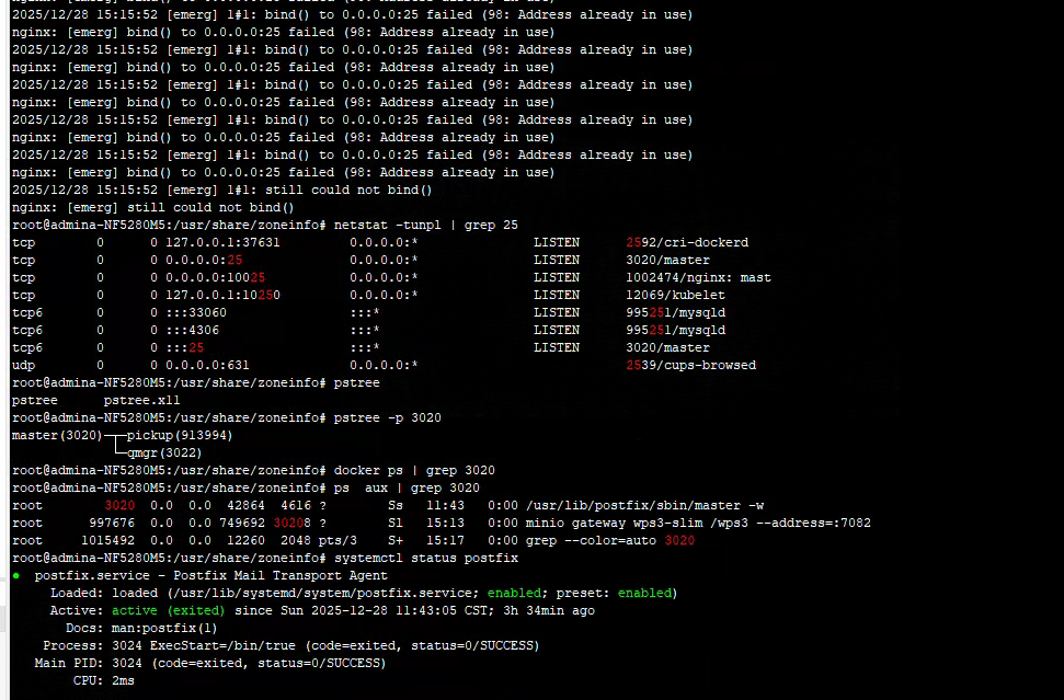 netstat 结果显示 10024/qmgr(进程ID:3020)占用了 0.0.0.0:25,结合 ps aux | grep 3020 确认该进程是 Postfix(邮件服务,master 进程)。