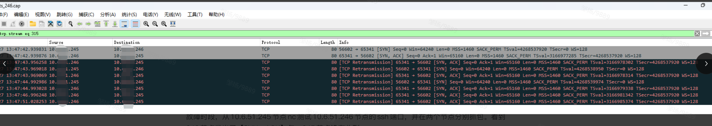 客户端(245) 的SYN重传:因未收到SYN-ACK,客户端按TCP协议重传SYN(图1第2-3行)。