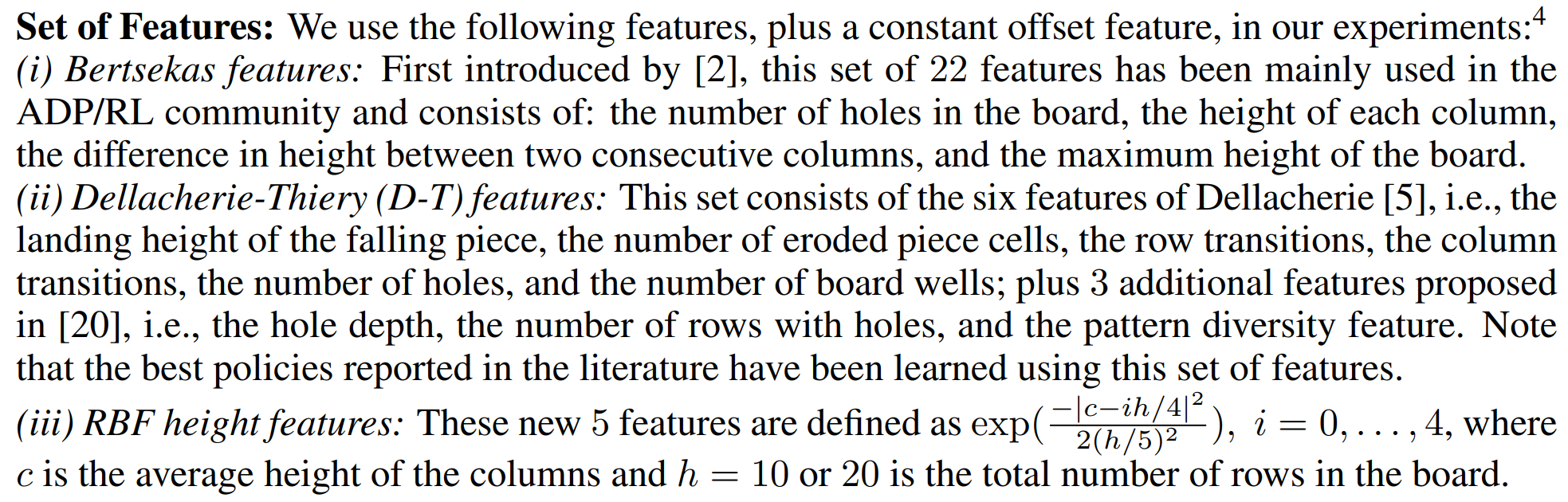 Bertsekas:22个特征 棋盘孔洞数量、每列高度、相邻两列的高度差以及棋盘最大高度。