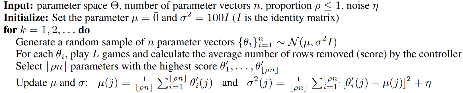 Learning Tetris Using the Noisy Cross-Entropy Method 论文链接 带噪交叉熵(防止过早收敛)