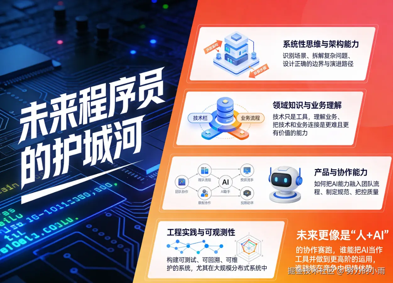 我今年每次利用AI IDE实现了需求或者项目,我就会考虑这个问题,我认为未来几年,程序员的"护城河"会发生微妙变化。以往靠基础编程功底吃饭的时代,面对大型模型产出的高质量代码,优势会被部分蚕食。真正长远的护城河,可能来自: