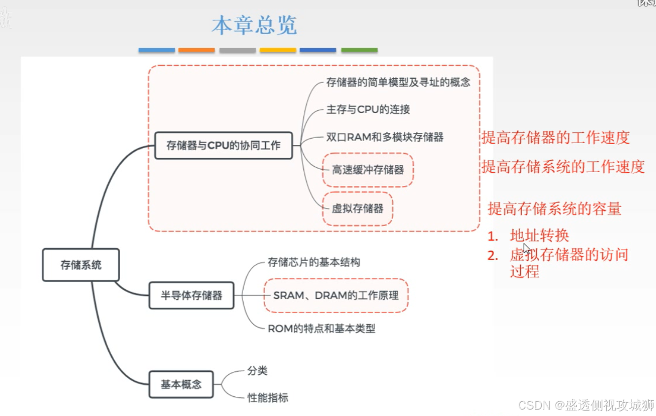 - 最后引入虚拟存储器概念,拓展了存储管理逻辑。全章揭示了通过多层次、不同特性的存储器协同工作,实现系统在速度、容量与成本间优化平衡的完整架构。