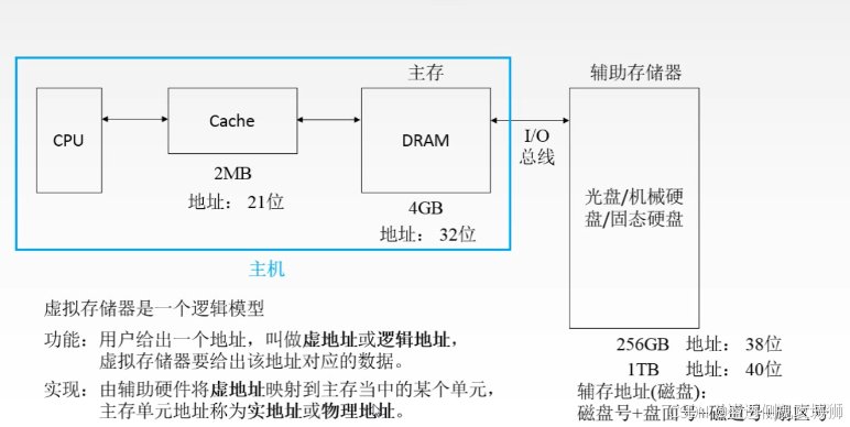 主存与 Cache之间的信息调度功能全部由硬件自动完成。**而主存与辅存层次的调度目前广泛采用虚拟存储技术实现,即将主存与辅存的一部分通过软/硬结合的技术组成虚拟存储器,**程序员可用这个比主存实际空间(物理地址空间)大得多的虚拟地址空间(逻辑地址空间)编程,当程序运行时,再由软/硬件自动配合完成虚拟地址空间与主存实际物理空间的转换。因此,这两个层次上的调度或转换操作对于程序员来说都是透明的。- 存取周期和存取时间有何区别?