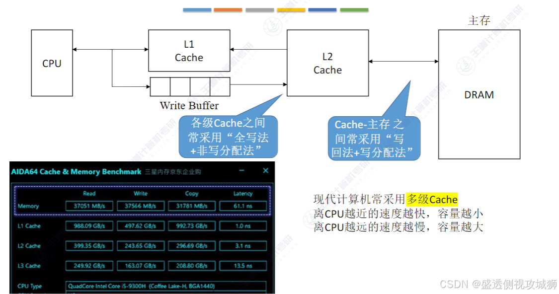 - 1)多级 Cache。现代计算机系统中,一般采用多级的 Cache系统。CPU执行指令时,先到速度最快的一级 Cache( LI Cache)中寻找指令或数据,找不到时,再到速度次快的二级Cache(L2 Cache)中找...最后到主存中找。