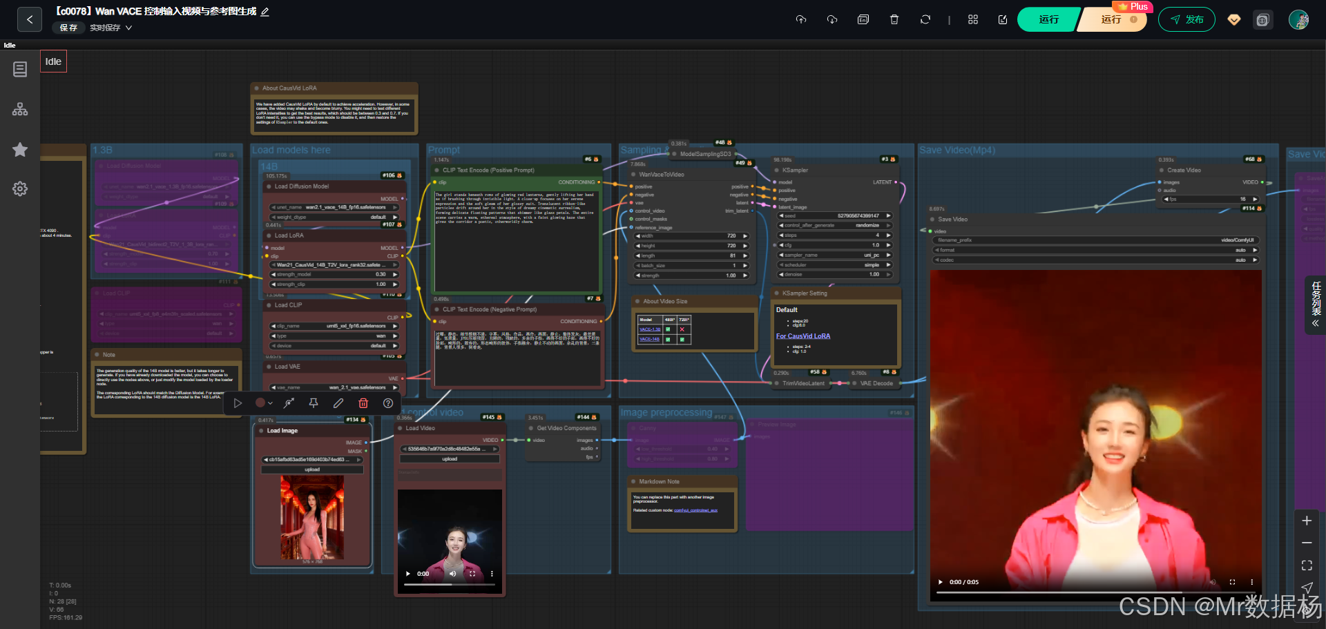 今天演示的案例是一个基于 Wan2.1 VACE 的 ComfyUI 视频生成工作流,整个流程通过加载多种核心模型并结合 CausVid LoRA 加速技术,实现了从文本提示、参考图像与控制视频到动态视频的生成。