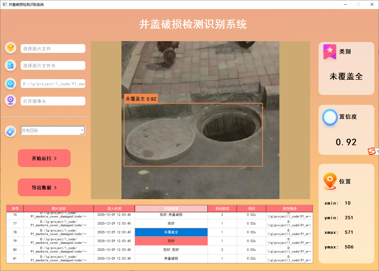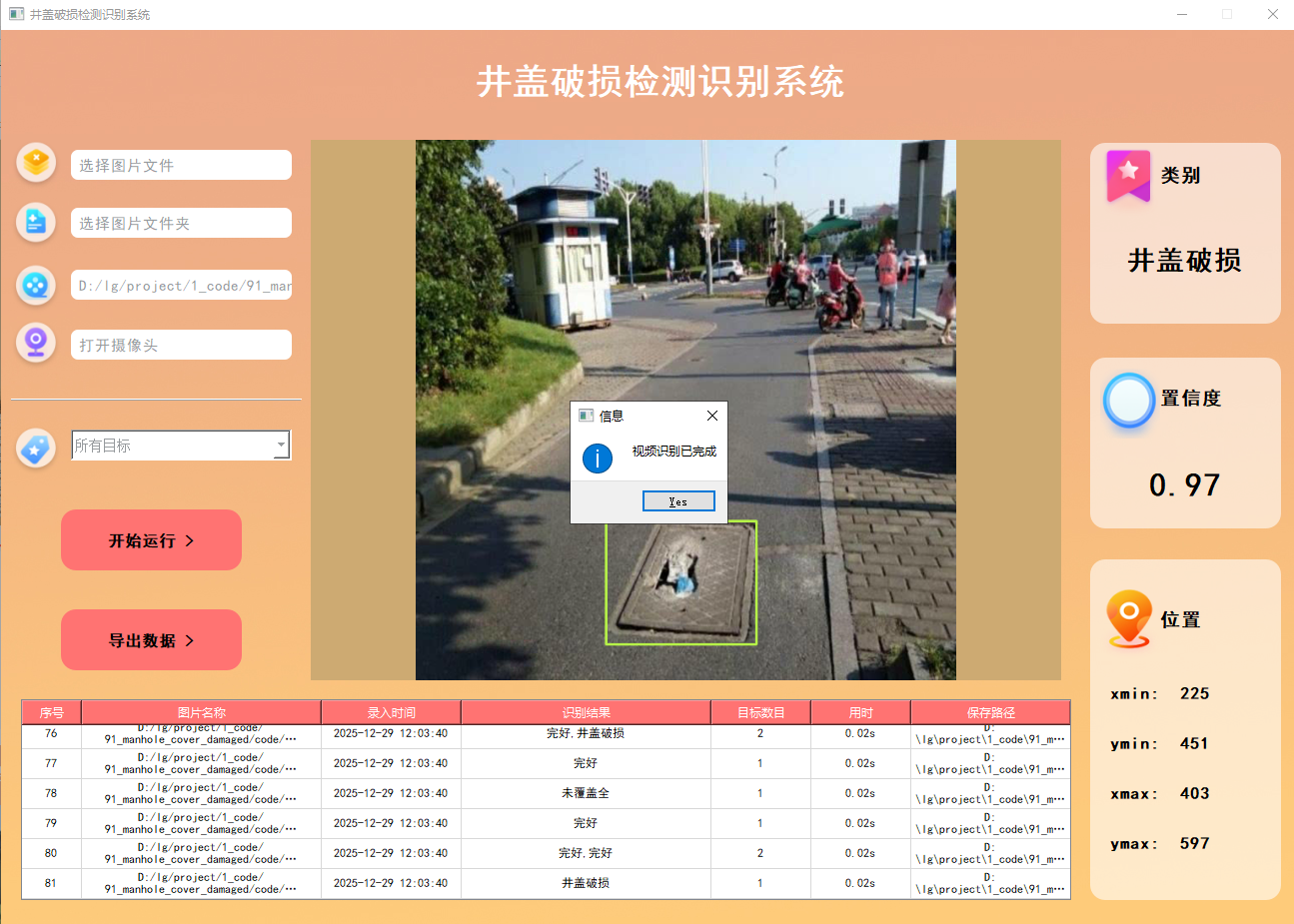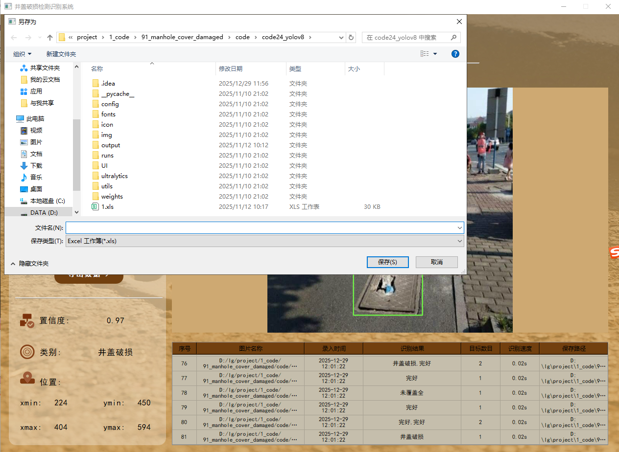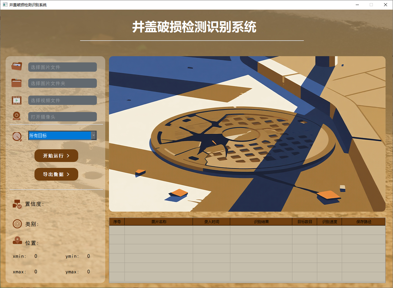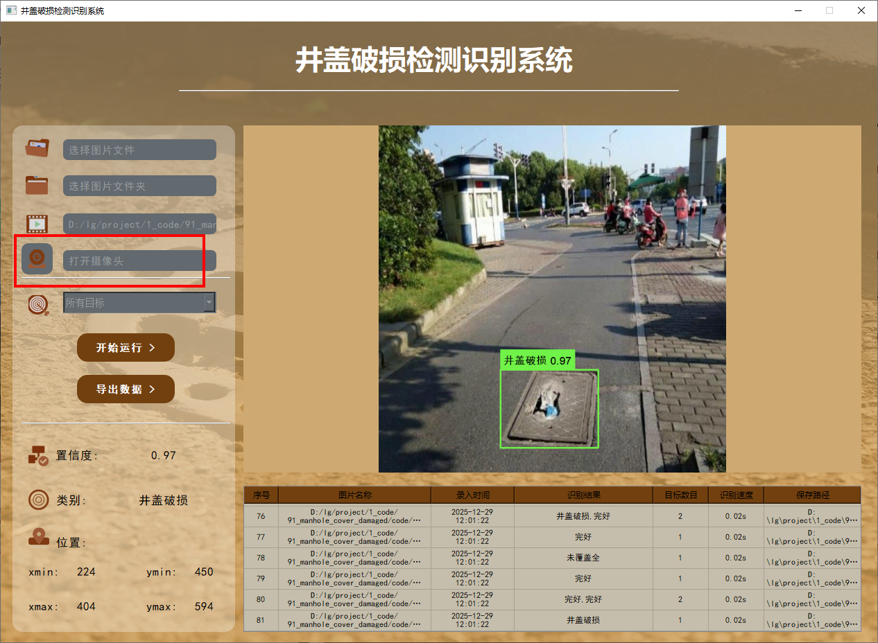 此外,我们开发了一款带有UI界面的井盖破损检测识别系统,支持实时检测井盖,并能够直观地展示检测结果。系统采用Python与PyQt5开发,可以对图片、视频及摄像头输入进行目标检测,同时支持检测结果的保存。本文还提供了完整的Python代码和详细的使用指南,供有兴趣的读者学习参考。获取完整代码资源,请参见文章末尾。
