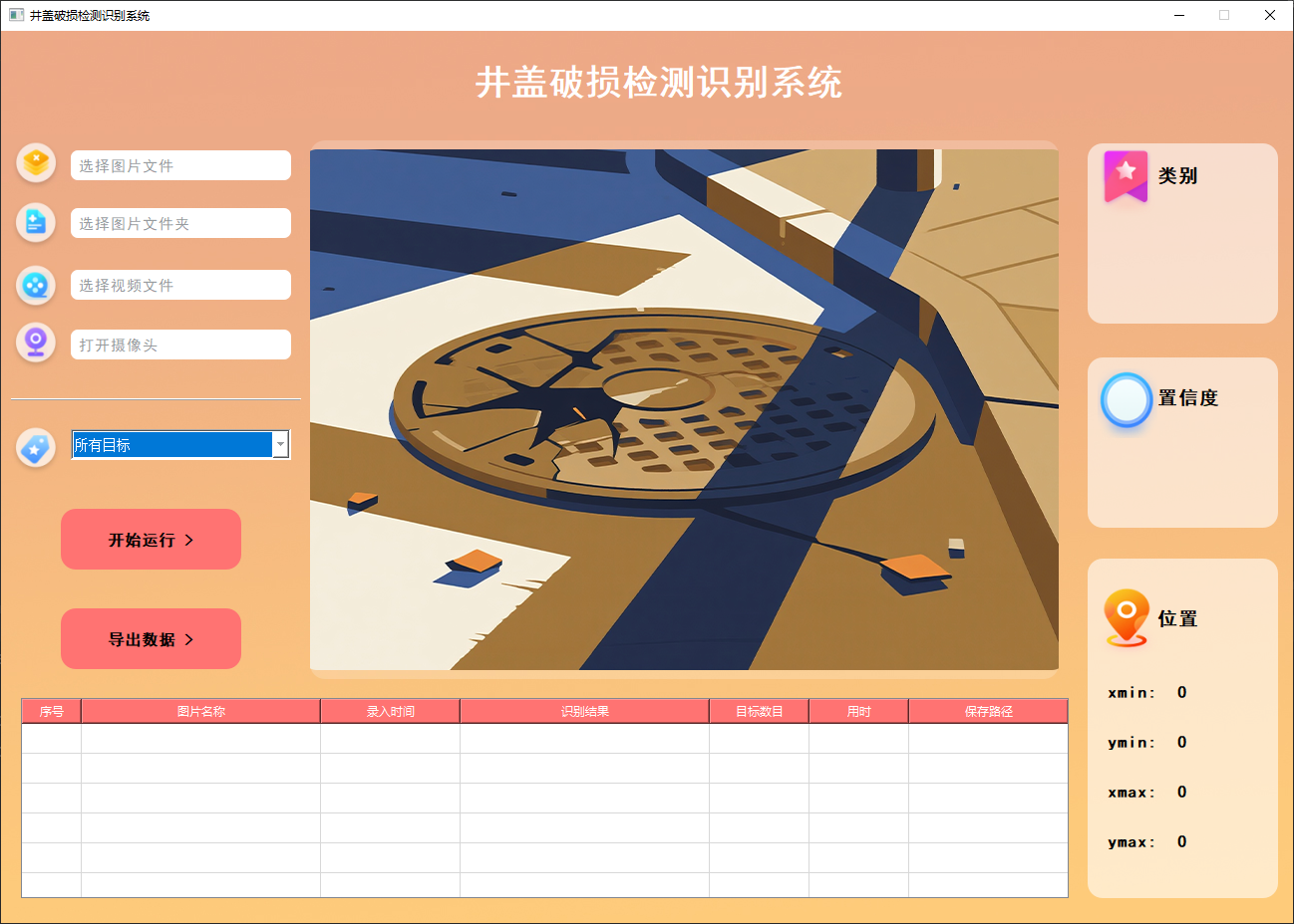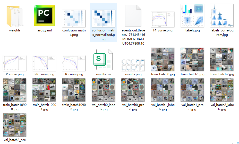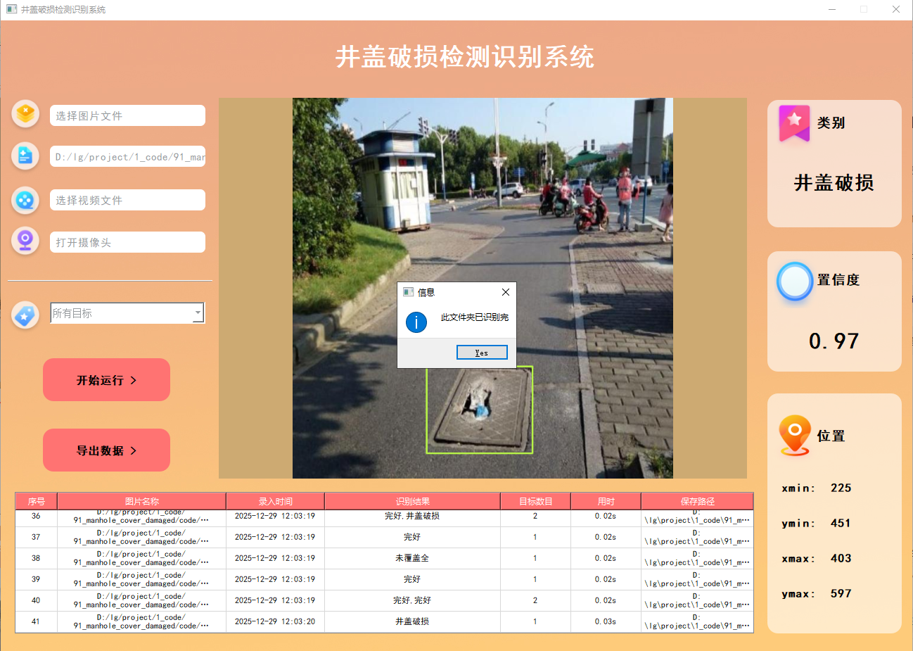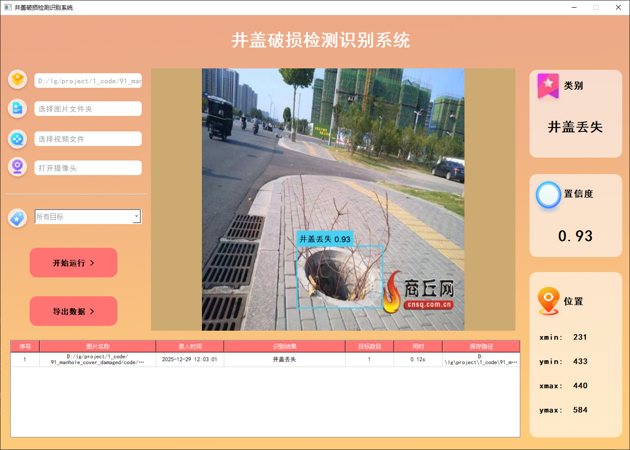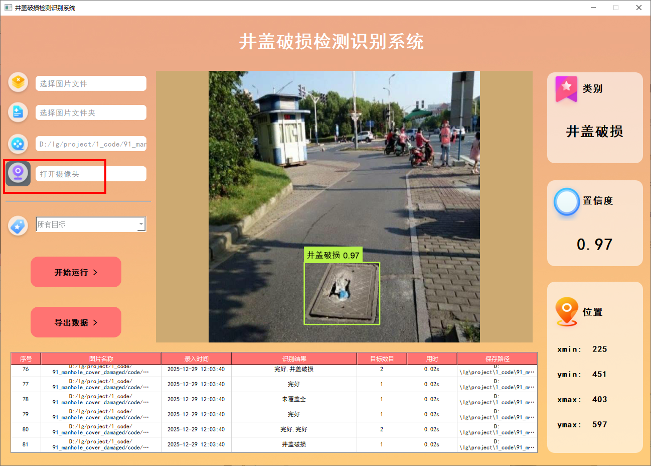 此外,我们开发了一款带有UI界面的井盖破损检测识别系统,支持实时检测井盖,并能够直观地展示检测结果。系统采用Python与PyQt5开发,可以对图片、视频及摄像头输入进行目标检测,同时支持检测结果的保存。本文还提供了完整的Python代码和详细的使用指南,供有兴趣的读者学习参考。获取完整代码资源,请参见文章末尾。