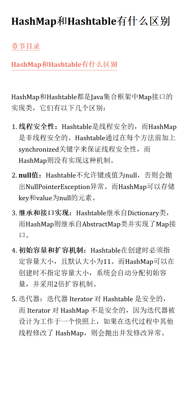 - 迭代器:迭代器 Iterator 对 Hashtable 是安全的,而 Iterator 对 HashMap 不是安全的,因为迭代器被设计为工作于一个快照上,如果在迭代过程中其他线程修改了 HashMap,则会抛出并发修改异常。