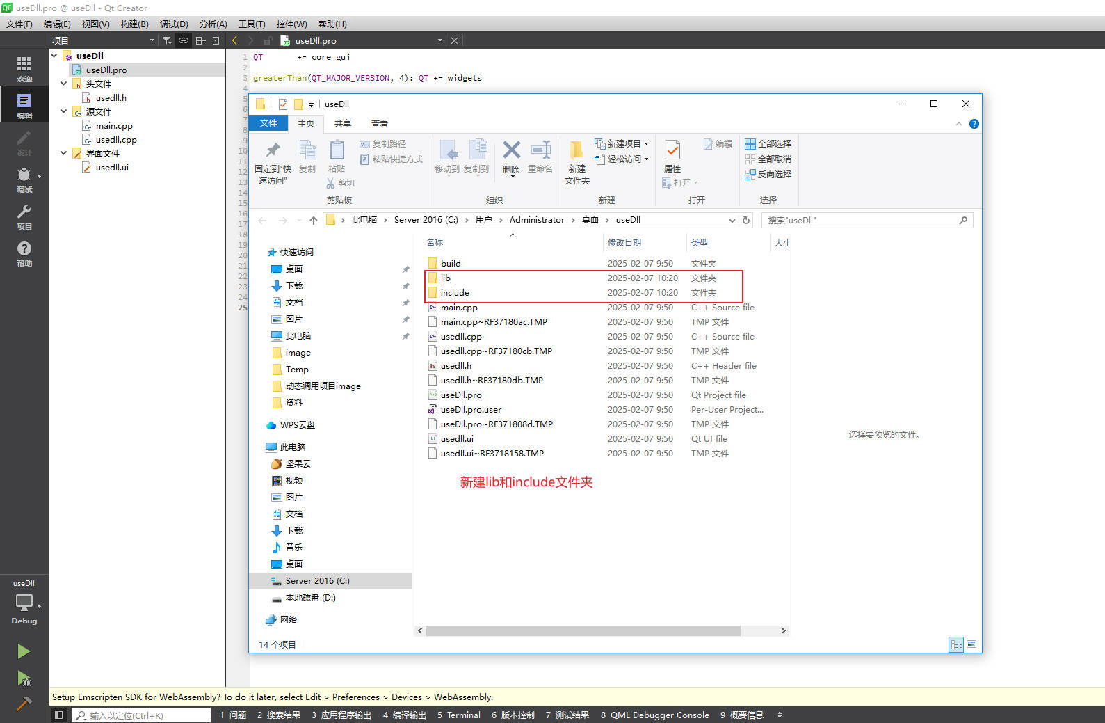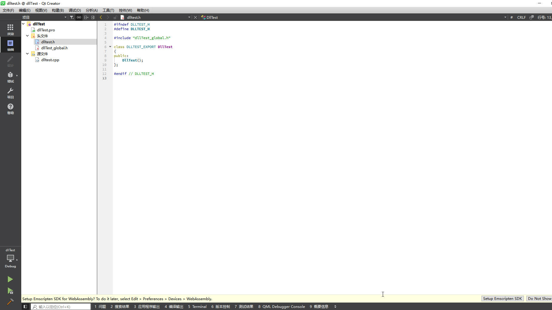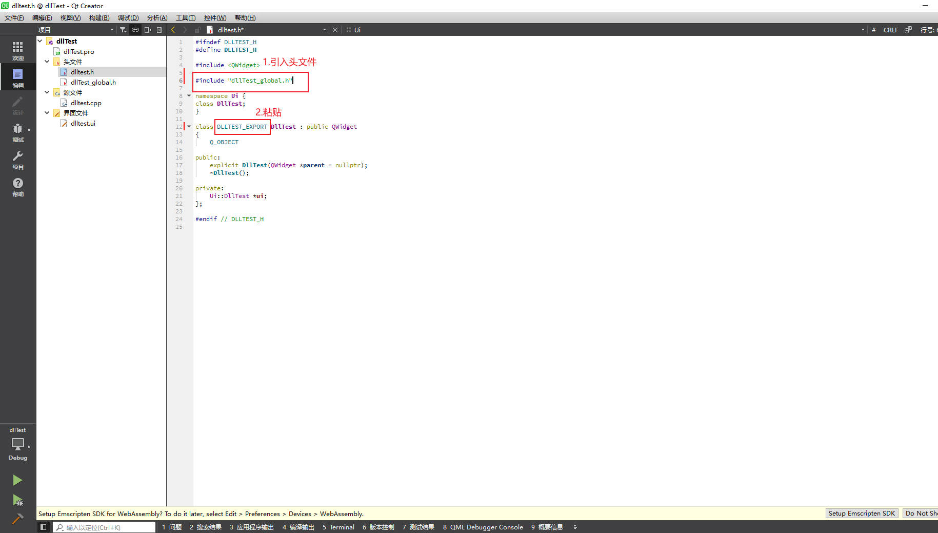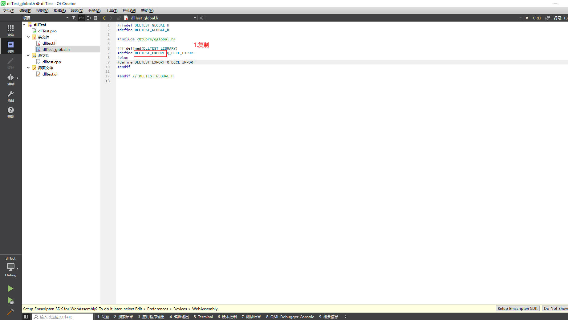 将创建的dllTest.dll复制到lib里,将dlltest.h、dllTest_global.h复制到include